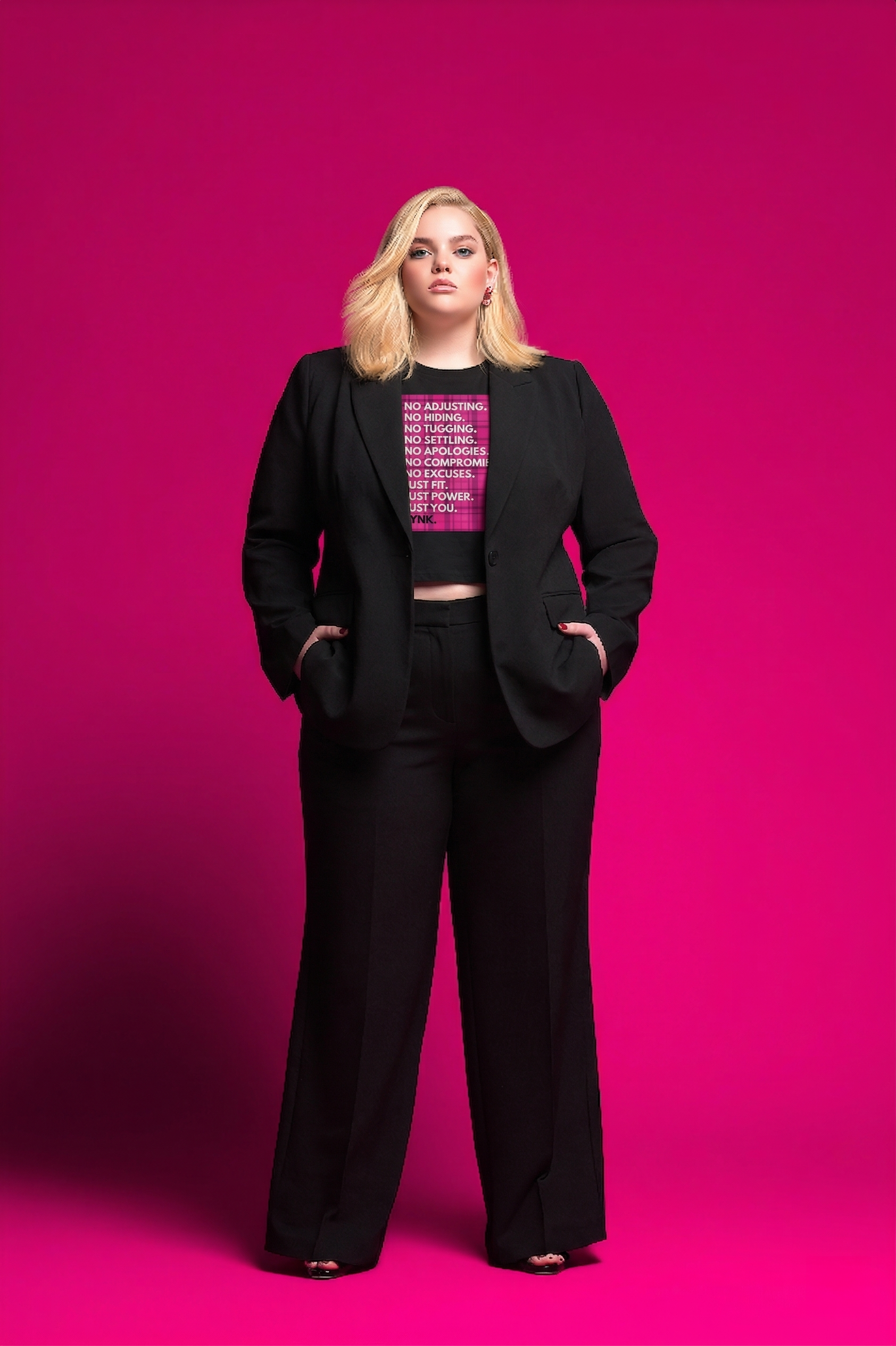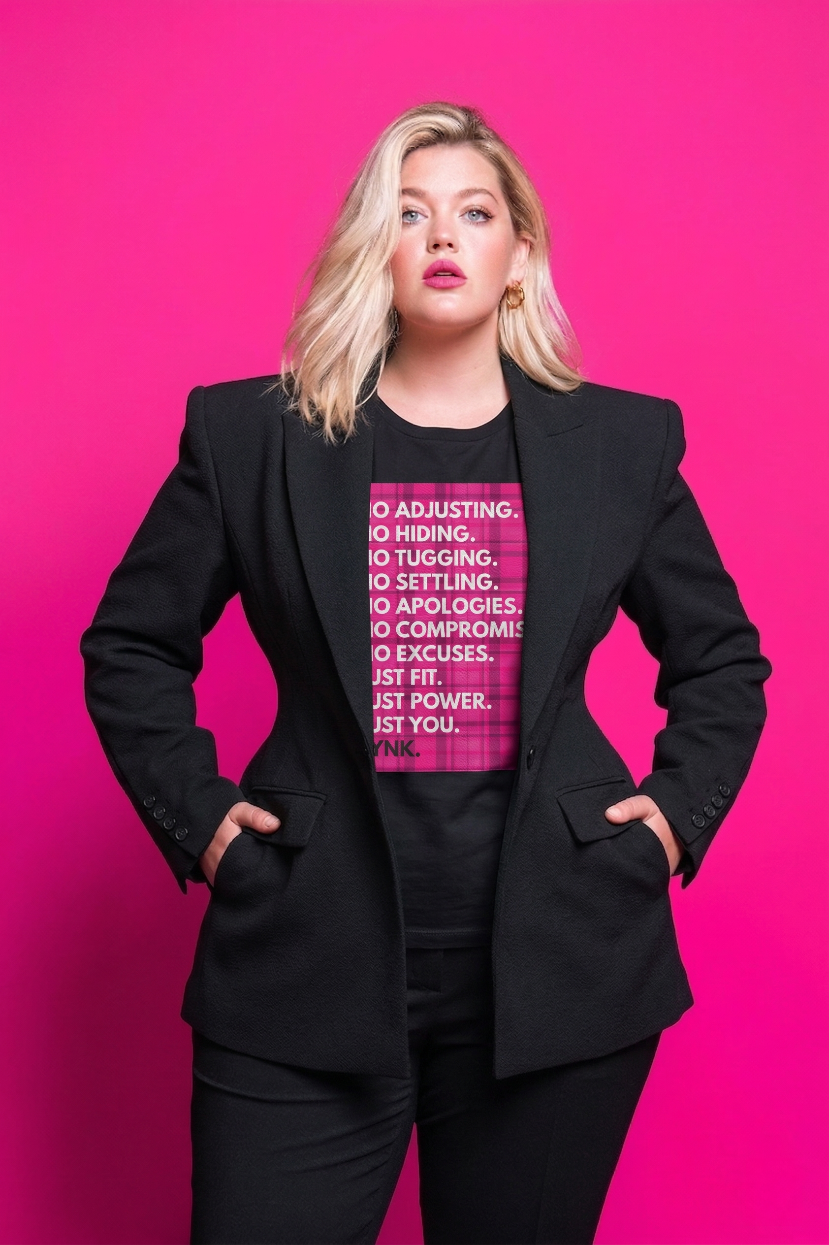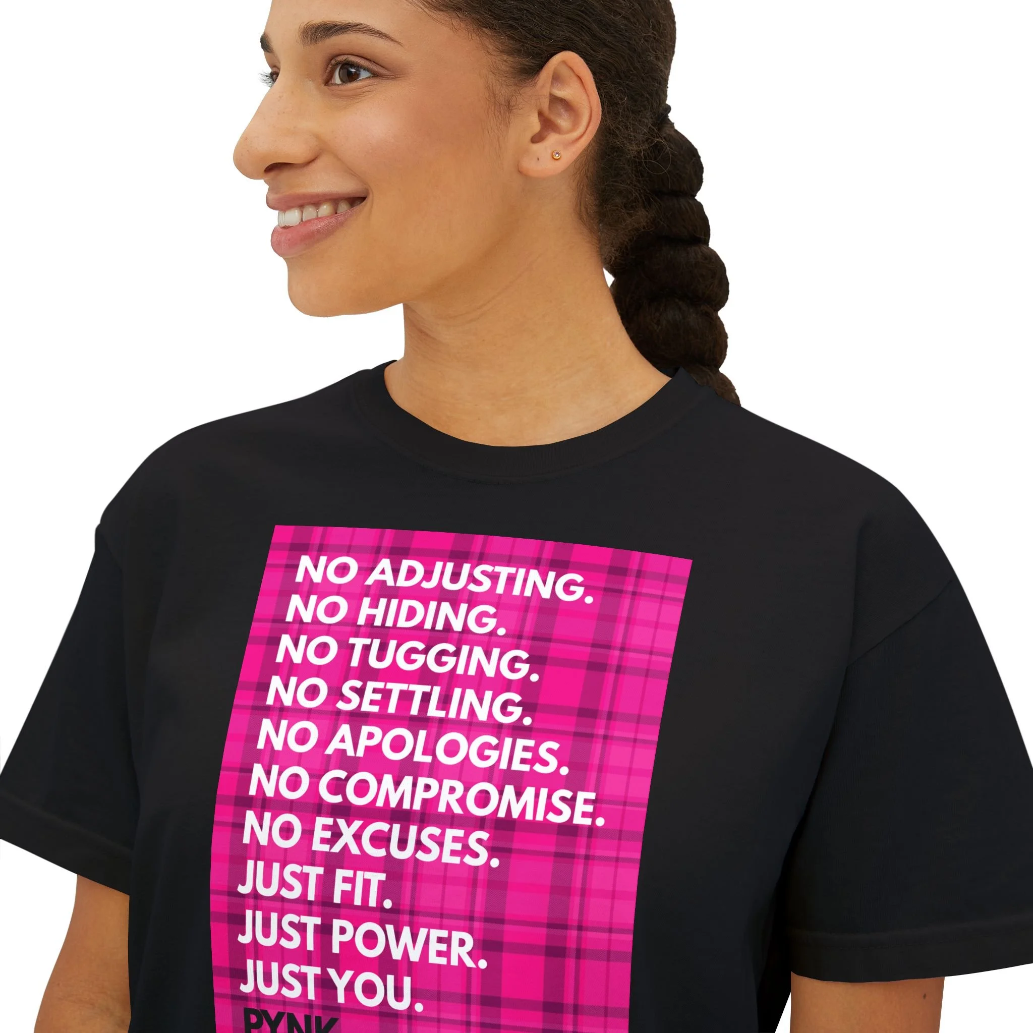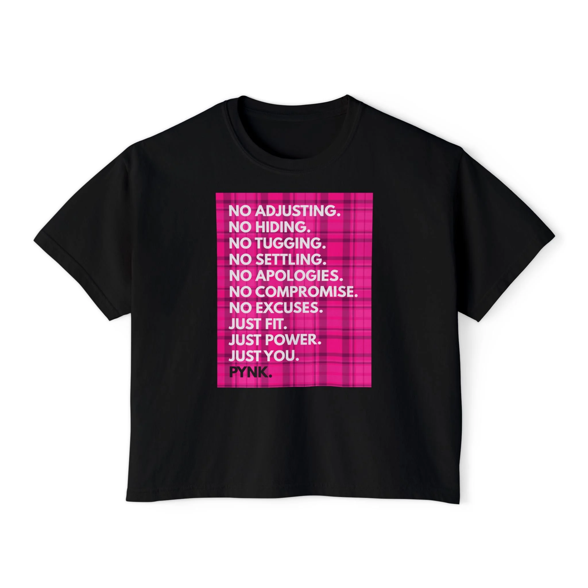 The PYNK Limited Drop Tee features our full “No Adjusting” manifesto — a direct response to everything women have been told to fix, hide, or change about their bodies.