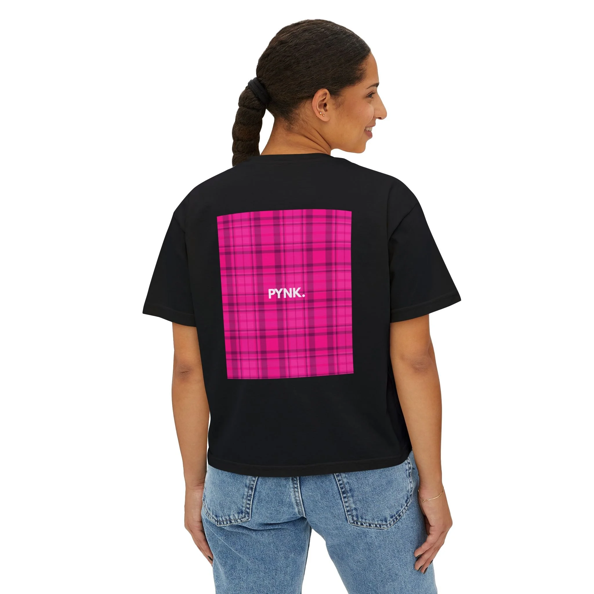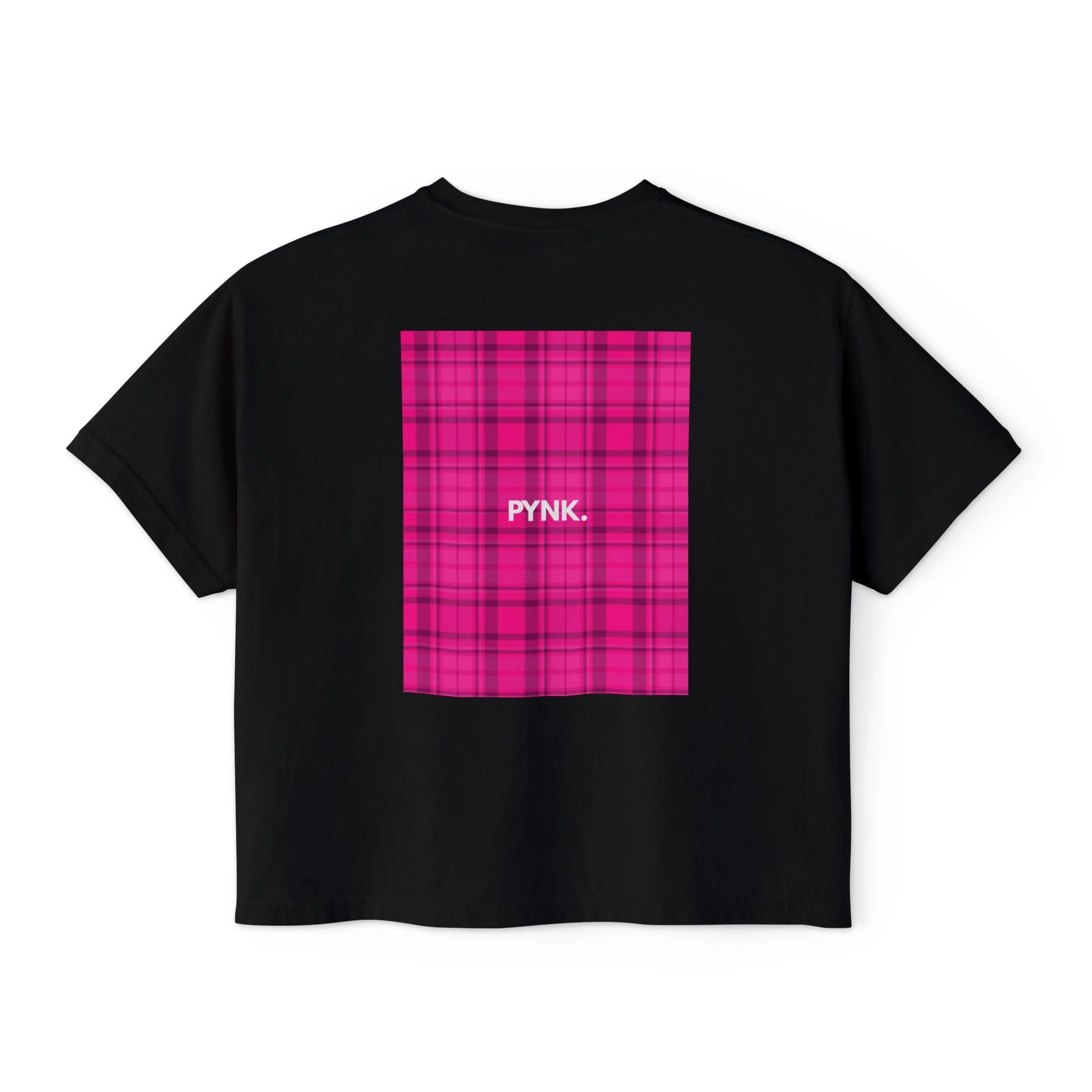 Set on a bold pink plaid panel with unapologetic typography, this piece is designed to be seen. The silhouette is relaxed but intentional — made to move with you, not against you.
